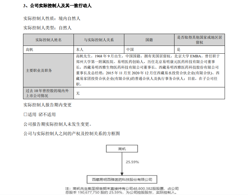 截至2025年第一季度末,高帆直接持有易明医药25.59%的股权。2024年年报显示,高帆是易明医药的控股股东、实际控制人,持股比例达25.59%。