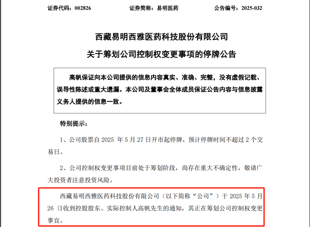 公告显示,5月26日,易明医药收到高帆的通知,高帆正在筹划易明医药的控制权变更事宜。