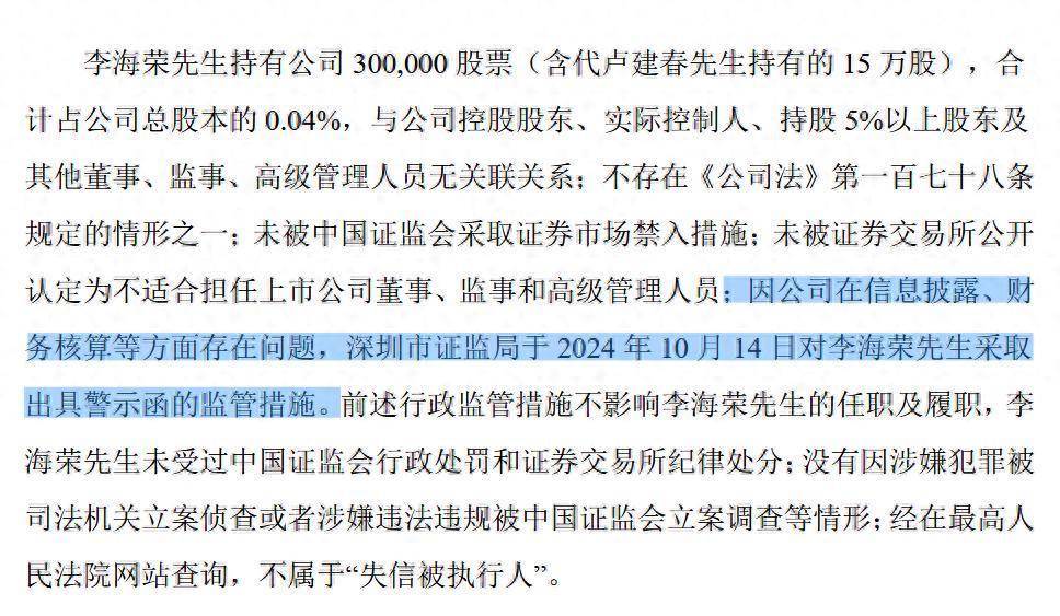 值得注意的是,因公司在信息披露、财务核算等方面存在问题,深圳市证监局于2024年10月14日对李海荣采取出具警示函的监管措施。*ST 名家强调前述行政监管措施不影响李海荣的任职及履职,李海荣未受过中国证监会行政处罚和证券交易所纪律处分;没有因涉嫌犯罪被司法机关立案侦查或者涉嫌违法违规被中国证监会立案调查等情形;经在最高人民法院网站查询,不属于“失信被执行人”。