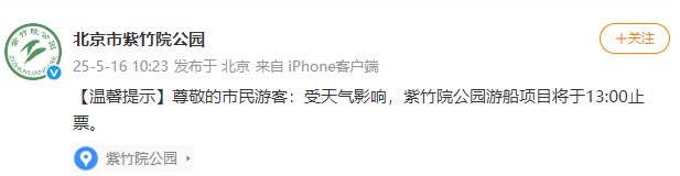 紫竹院公园:【温馨提示】尊敬的市民游客:受天气影响,紫竹院公园游船项目将于13:00止票。