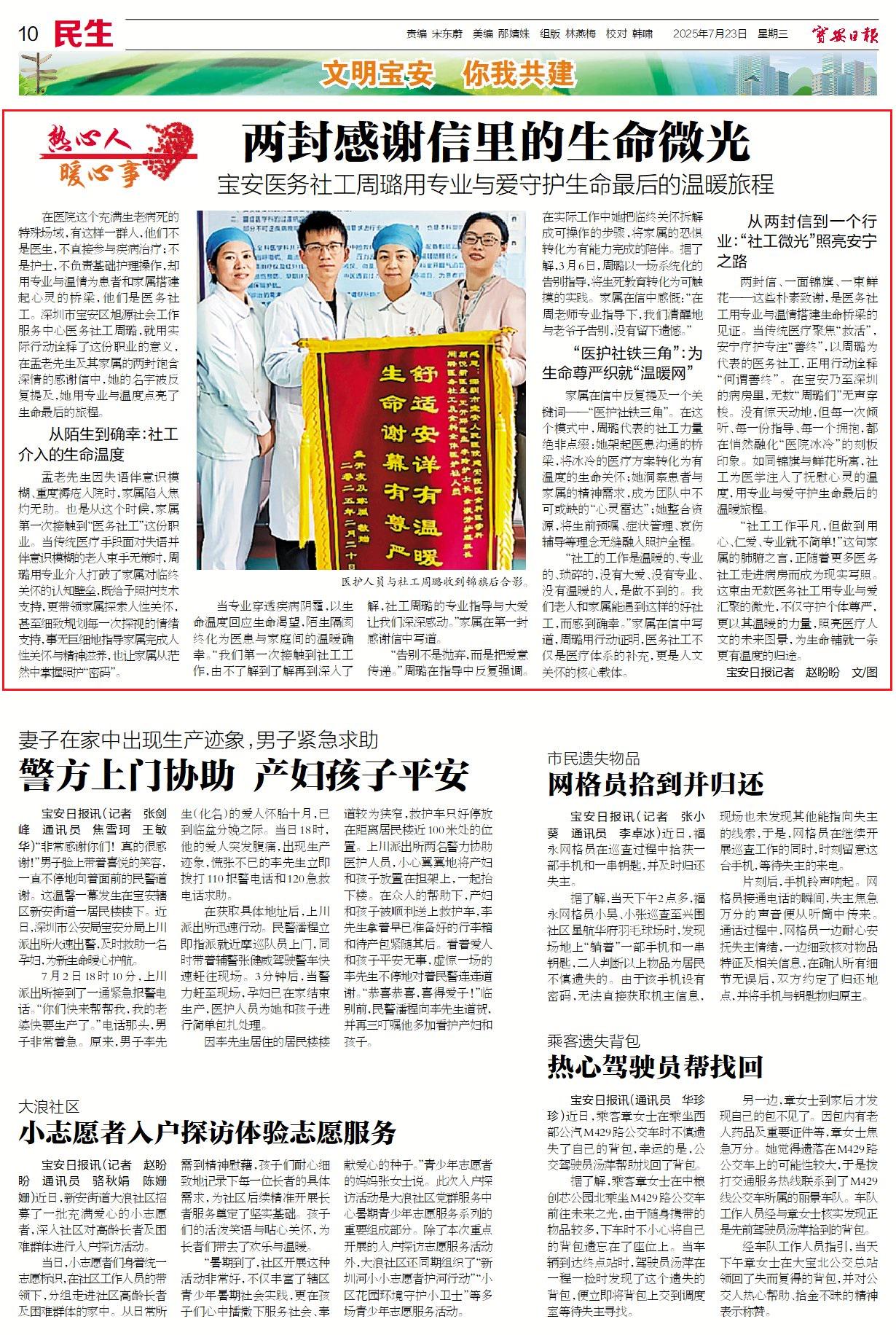 两封信、一面锦旗、一束鲜花——这些朴素致谢,是医务社工用专业与温情搭建生命桥梁的见证。当传统医疗聚焦“救活”,安宁疗护专注“善终”,以周璐为代表的医务社工,正用行动诠释“何谓善终”。在宝安乃至深圳的病房里,无数“周璐们”无声穿梭。没有惊天动地,但每一次倾听、每一份指导、每一个拥抱,都在悄然融化“医院冰冷”的刻板印象。如同锦旗与鲜花所寓,社工为医学注入了抚慰心灵的温度,用专业与爱守护生命最后的温暖旅程。