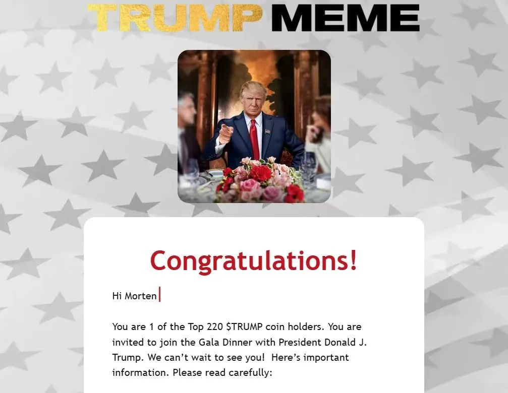 特朗普此前宣布,持有TRUMP最多的前220名买家可与其共进晚餐,直接听到特朗普谈论“加密货币的未来”。前25名持有者还可与特朗普一同参加“超级独家私人VIP招待会”以及“特别VIP之旅”,其中包括VIP参观白宫。特朗普声称这是“世界上最独家的邀请”。
